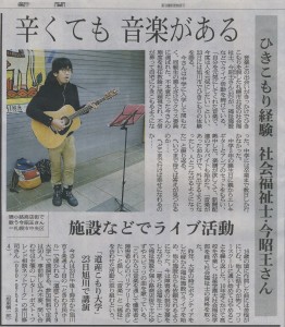 朝日新聞北海道支社朝刊2016.1.20に「辛くても音楽がある」、ひきこもり経験がある社会福祉士の今昭王さんが大きく報道されました。