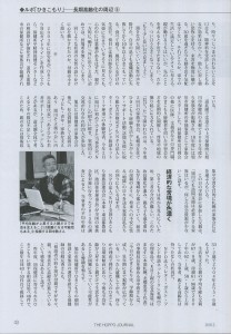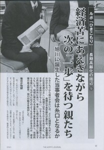 2016.1.15発売の月刊誌「北方ジャーナル」2月号【連載】ルポ 「ひきこもり」──長期高齢化の周辺5 経済苦にあえぎながら次の「一歩」を待つ親たち 旭川に誕生した当事者会は糸口となるか。に4頁にわたり旭川にアウトリーチを展開してきた当NPOの実践活動が記載されました。