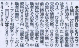 11月18日北海道新聞朝刊道北全域版に11/27開催の「北海道ひきこもりカフェin旭川」の案内が掲載されました