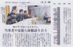 11月27日開催の「北海道ひきこもりカフェIN旭川」のことが北海道新聞朝刊道北圏全域版2016.11.28に掲載されました。
