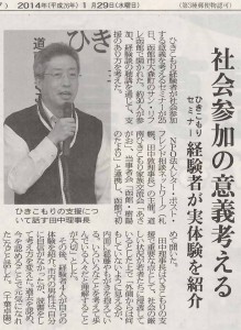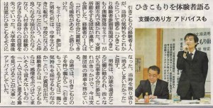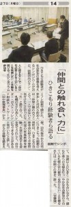 1月27日月曜日、1月25日に開催された北海道新聞・みなみ風と朝日新聞、1月27日には函館新聞各紙に道南ひきこもり家族交流会「あさがお」・当事者会「樹陽のたより」提携による「ひきこもり経験者参画型地域連携社会参加促進事業」のことが報道されました。