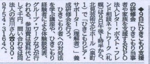 8月9日土曜日開催の「ひきこもり地域拠点型アウト・リーチ支援・ひきこもりピア・サポーター養成研修事業in北見開催」の案内が北海道新聞オホーツク北見圏域版に掲載されました。