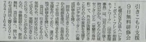 北海道新聞室蘭支社により10月9日木曜日開催の「ひきこもり地域拠点型アウト・リーチ支援・ひきこもりピア・サポーター養成研修事業in室蘭開催」の案内が室蘭・胆振圏版紙面に掲載されました。北海道室蘭保健所が後援となり会場資料印刷等を無償提供されます。そのため無料にて開催されます。お近くの方はぜひご参加ください。