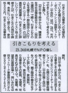 北海道新聞朝刊2015.10.21に10月23日のプレ企画、24日の「ひきこモシリフューチャーセッション」の案内が掲載されました。先着順となっていますのでお早めに。