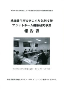 2020年度公益財団法人日本社会福祉弘済会社会福祉助成金事業「地域共生型ひきこもり包括支援プラットホーム構築研究事業報告書」A4判全36頁が完成しました。札幌圏3地域で実施しましたプラットホーム実践をまとめています。多くの地元支援団体機関と当事者団体NPOが協働して行う当事者主体活動における試行モデルとしてご参考となれば幸いです。関心のある方で希望者には1冊500円でお送りいたします。事務局までご連絡ください。