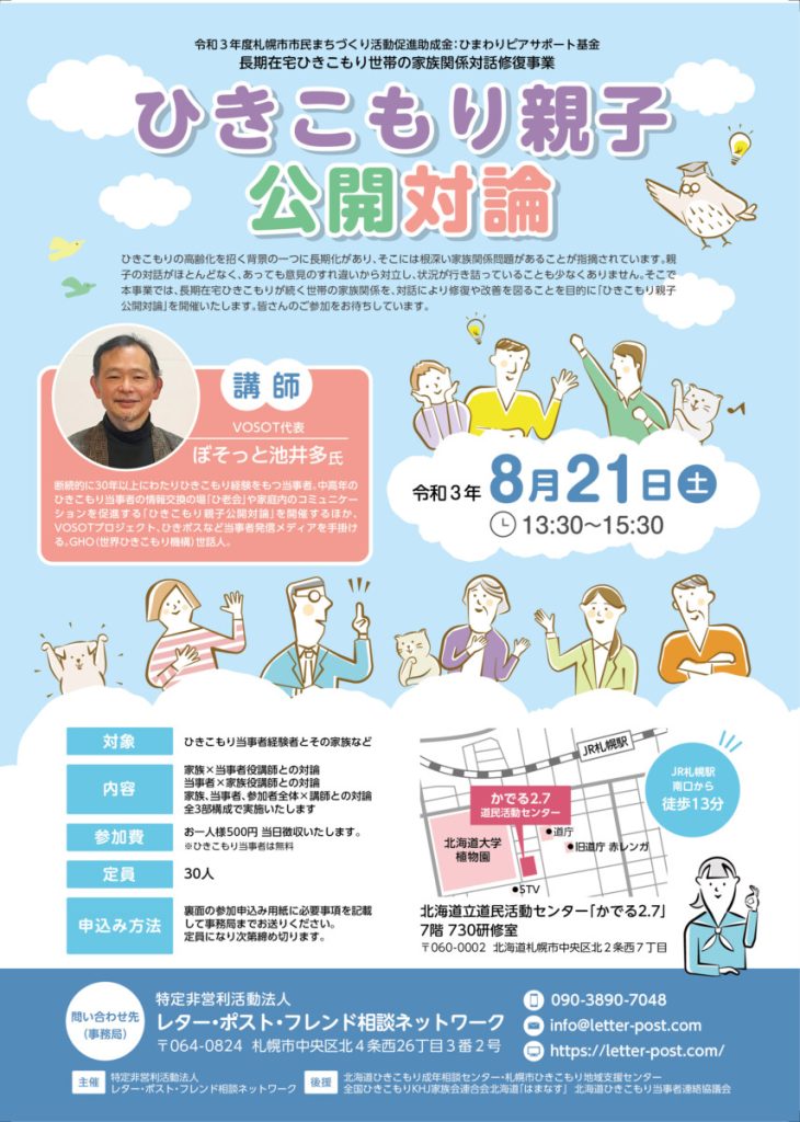 そこで本事業では、長期在宅ひきこもりが続く世帯の家族関係を、対話により修復や改善を図ることを目的に「ひきこもり親子 公開対論」を開催いたします。