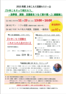 北海道ソーシャルワーカー協会主催「2019年度ひきこもり支援セミナー③」「ひきこもりって何だろう~当事者・家族・支援者をつなぐ架け橋」(函館編)が2019年11月23日土曜日午後1時から4時まで函館・サンリフレ(函館市大森町2番14号)にて開催されます。