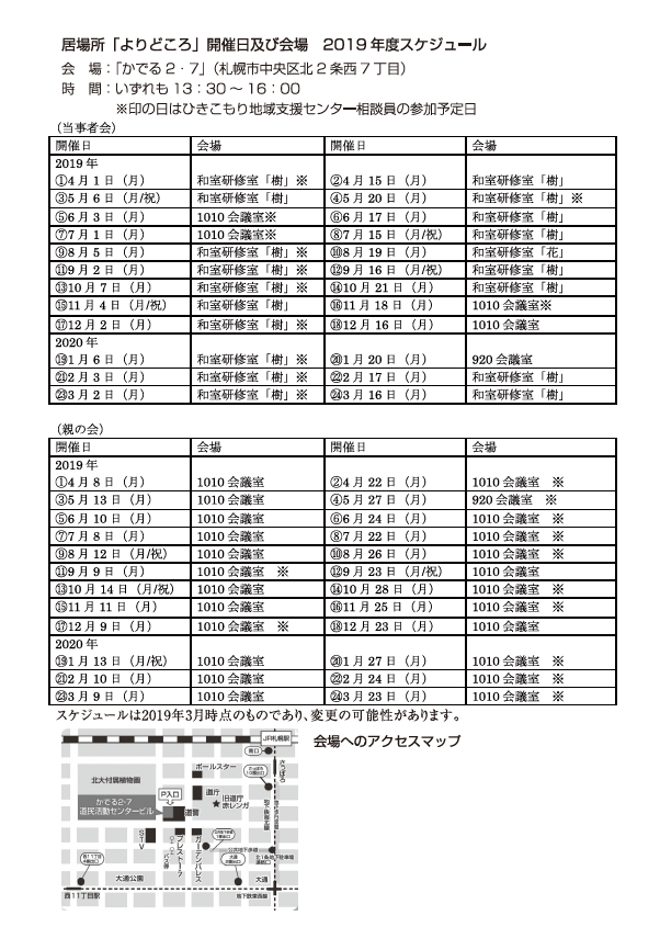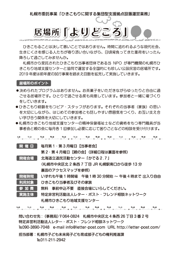 札幌市から受託されたひきこもり当事者団体である当NPOが専門機関の札幌市ひきこもり地域支援センターとの協同で運営する全国的にも珍しい公設民営の居場所です。
