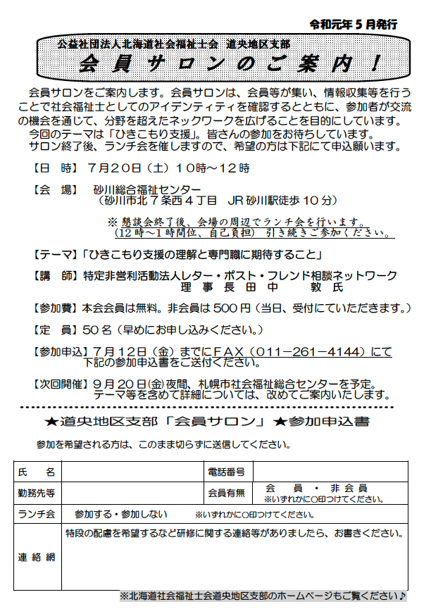 公益社団法人北海道社会福祉士会道央地区支部会員サロン(2019年7月20日)のご案内