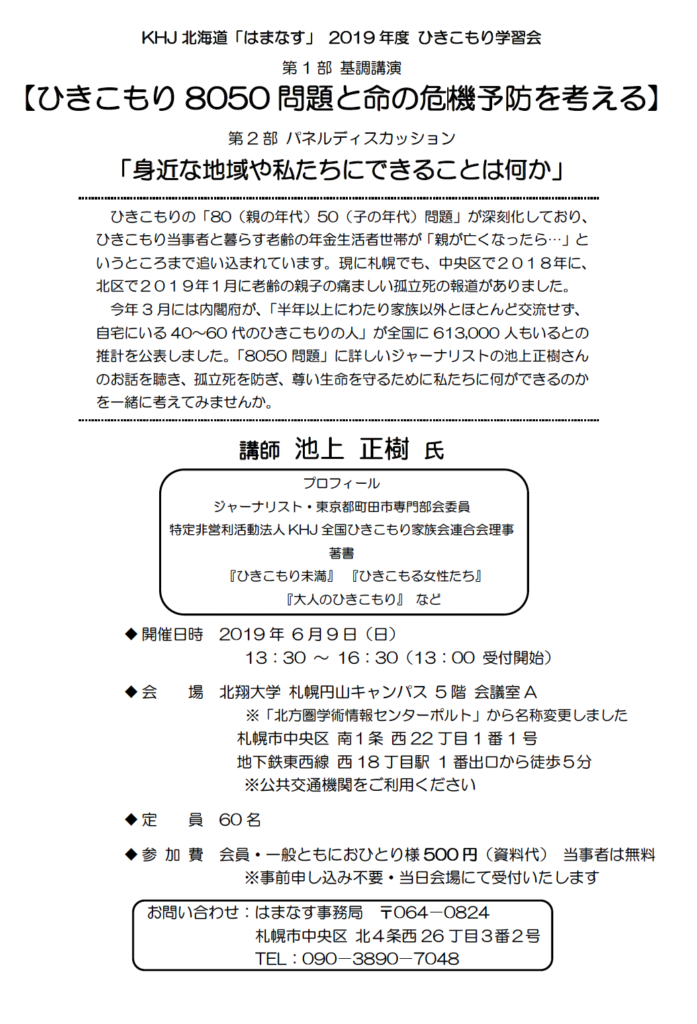 ひきこもりの「80(親の年代)50(子の年代)問題」が深刻化しており、ひきこもり当事者と暮らす老齢の年金生活者世帯が「親が亡くなったら…」というところまで追い込まれています。現に札幌でも、中央区で2018年に、北区で2019年1月に老齢の親子の痛ましい孤立死の報道がありました。