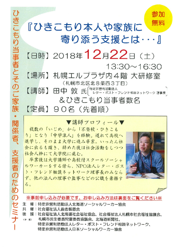 | 講師 | 田中敦氏&ひきこもり当事者数名 (NPO法人レター・ポスト・フレンド相談ネットワーク理事長) |