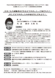 このたび平成30年度札幌市市民まちづくり活動促進助成金:ひまわりピアサポート基金採択のもと「札幌圏ひきこもりピアサポート活動理解普及啓発事業」の一環として、ひきこもり経験者ができるピアサポートって何だろう?そしてピアサポートの中身を学んでみよう!を開催いたします。