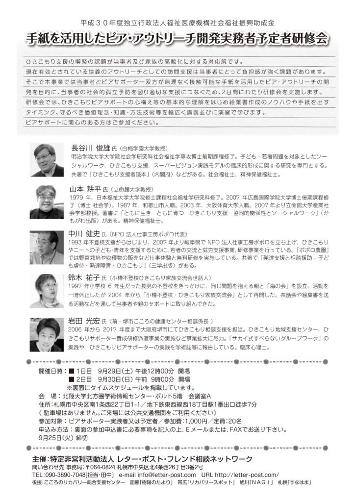 ひきこもり領域のピアサポートが発展途上にあるなか、当NPOでは当事者とピアサポーター双方に無理なく接点をもつ手紙(絵葉書)を活用したピア・アウトリーチ開発実務者予定者研修会を開催することになりました。電話や訪問援助に傾倒しがちな支援領域において見返りを求めずさりげなく送る手紙(絵葉書)が果たす役割を研究者と実践者の協力を得て二日間にわたって開催いたします。ピアサポーターに関心を寄せるひきこもり当事者経験者のご参加をお待ちしています。FAX番号011-271-5804