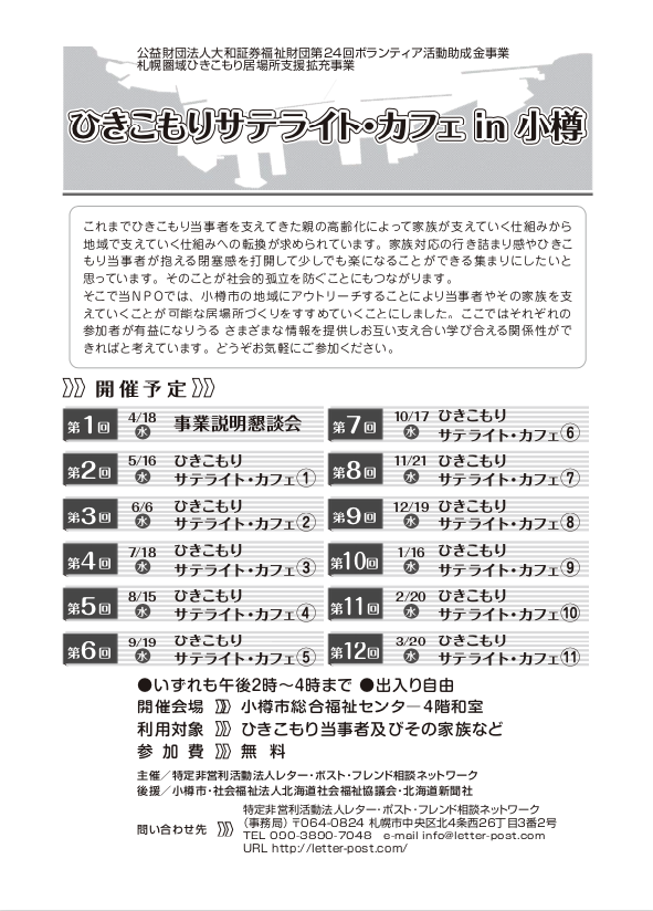 公益財団法人大和証券福祉財団第24回ボランティア活動助成金札幌圏域ひきこもり居場所支援拡充事業「ひきこもりサテライト・カフェin小樽」を毎月1回開催します。