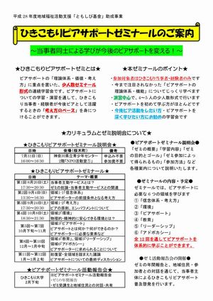 ひきこもり当事者グループ「ひき桜」in横浜主催、平成28年度神奈川県「ともしび基金」助成金事業「当事者主体によるひきこもりピアサポート普及啓発事業」の一環として「ひきこもりピアサポートゼミナール」が8月から開講されます。連続したゼミ(定員20名)でピア・スタッフネットワークが共催提供した翻訳テキストを活用し、ひきこもりピア・サポートへ応用していく実践です。当法人が設立して以来、道外の当事者団体に後援者としてバックアップするのは今回が初めてであり、本事業を契機に「当事者同士のつながりが深まり、一人ひとりの当事者がコミュニティに必要な参画者」として発展していくことを願っています。参加対象はひきこもり当事者経験者で事前申込みが必要です。詳細は案内チラシをご参照ください。