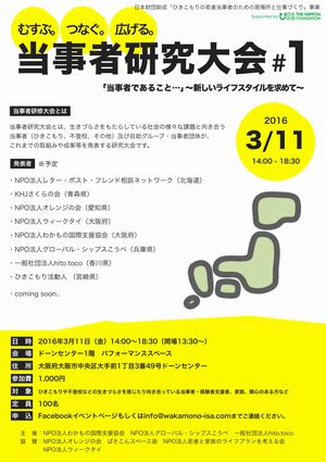「当事者であること・・・」~新しいライフスタイルを求めて~ 当事者研究大会とは、ひきもりや不登校など、生きづらさをもたらしている社会の様々な課題と向き合う当事者及び自助グループ・当事者団体が、これまでの取組みや成果等を発表する研究大会です。 オルタナティブな(新しい、別な)生き方を求めている若者に焦点を当て、学術的な理論から市民団体による具体的な実践に及ぶ情報・知恵・資源の交流促進を目指します。
