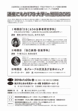 子ども・青年・家族を支え合う旭川そよ風の会と連携して、道北旭川圏に初めてひきこもり当事者会NAGIが創設されて1年が経ちました。これを記念して「道産こもり179大学in旭川2015」を開催します。みなさんのご参加をお待ちしています! 詳細はPDFをご参照ください。