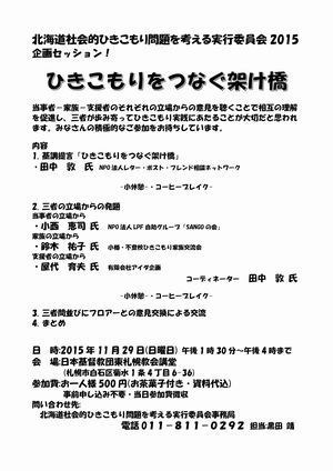 当事者-家族-支援者のそれぞれの立場からの意見を聴くことで相互の理解を促進し、三者が歩み寄ってひきこもり実践にあたることが大切だと思われます。みなさんの積極的なご参加をお待ちしています。