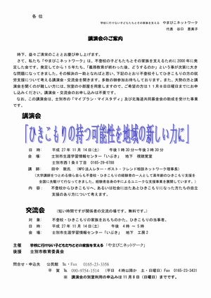 「やまびこネットワーク」は、不登校の子どもたちとその家族を支えるために2000年に発足した会です。発足してから15年たち、「義務教育が終わった後、どうするのか」という事が次第に大きな問題になってきました。その解決の一助となればと思い、下記のとおり不登校そしてひきこもりの方の就労支援について考える講演会・交流会を開きます。多数の御参加お待ちしております。また、大勢の方と講演会を聞くのが難しい方には、別室の小部屋を用意しますので、ご希望の方は11月8日日曜日までにお申し込みください。講演会・交流会のお申し込みは不要です。