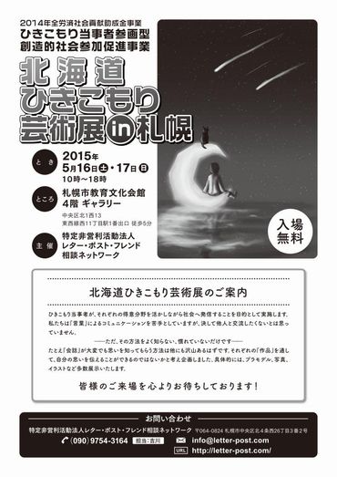 ひきこもり者が持っている芸術的(Art)センスや独自の感性を活かす創造的活動(モノづくりなど)を通して、ひきこもり者の自信回復と社会参加促進をすすめ、広く市民に向けてひきこもりの理解啓発と孤立予防を図っていく「北海道ひきこもり芸術展」を平成27年5月16日~17日札幌市教育文化会館4階ギャラリーで開催します。