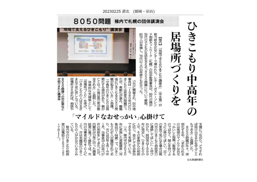 2月17日午後3時から、稚内市主催「地域で支えるひきこもり」講演会が稚内市総合文化センターで開催され、当NPOの理事長が登壇し約70名が参加しました。