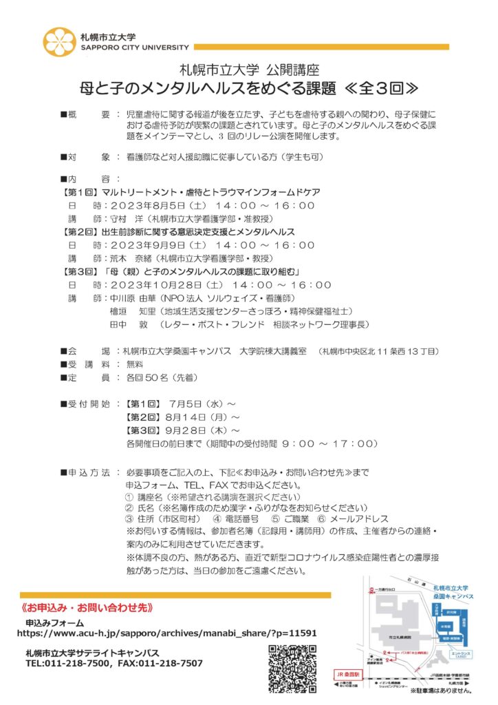 札幌市立大学の公開講座「母(親)と子のメンタルヘルスの課題に取り組む」案内