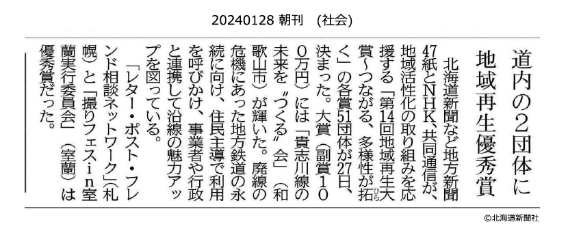 地方新聞47社とNHK、共同通信社で構成し選定する「第14回地域再生大賞」の選考結果が公表されました。 当法人は「優秀賞」を受賞することになりました。 エントリーされるだけでも大変なことなのに有難くここに感謝いたします。 2月15日受賞者式典がオンラインにてつないで行われ、北海道新聞社を通して表彰状と盾を受け取ります。