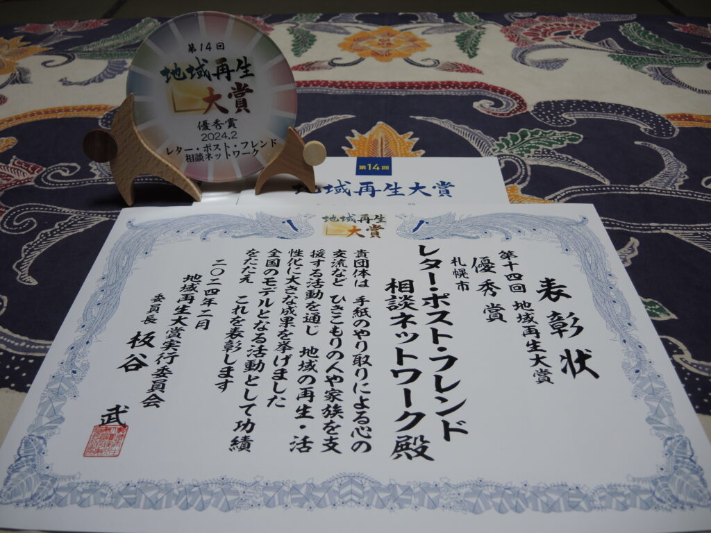 2月15日木曜日、地方新聞47社とNHK、共同通信社が運営する 「第14回地域再生大賞」の授賞式が行われ、 ㈱北海道新聞社企画室を通して、表彰状と盾を受け取りました。 団体活動を続け今年で満25年を迎えます。 日頃からの皆様のご厚情に深く感謝いたします。