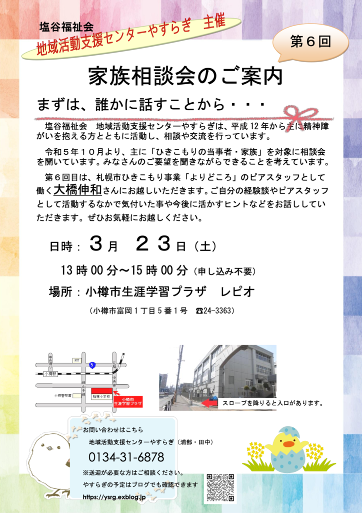 3月23日土曜日13:00-15:00、 当法人が運営する集団型支援拠点「よりどころ」のピアスタッフであります大橋伸和氏の講演&「無料相談会」が 小樽市生涯学習プラザ「レピオ」で行われます。 お近くの方はぜひご参加ください。