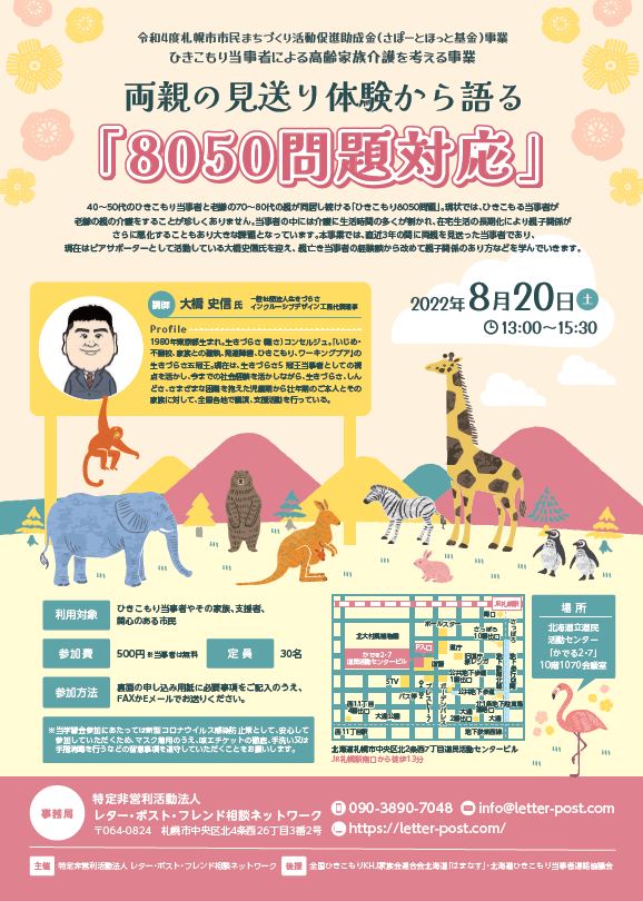 今年度の企画は、ひきこもり当事者による高齢家族介護をテーマに、直近3年間に両親を見送った当事者であり、